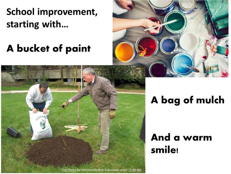 A bucket of paint 🎨, a bag of mulch 🌳, and a smile 😄 to improve a school?